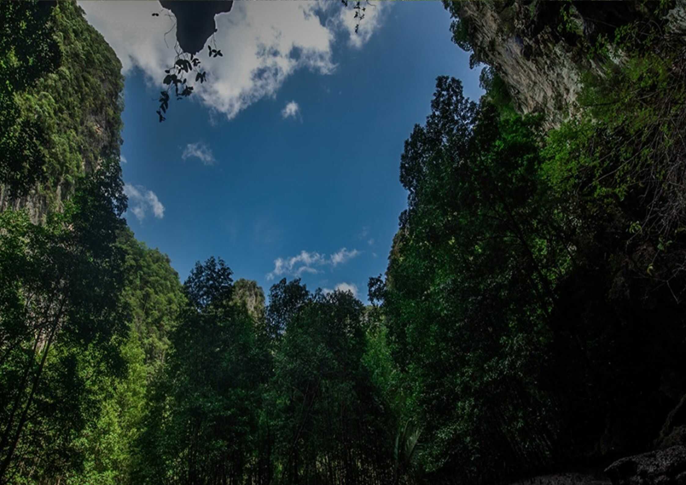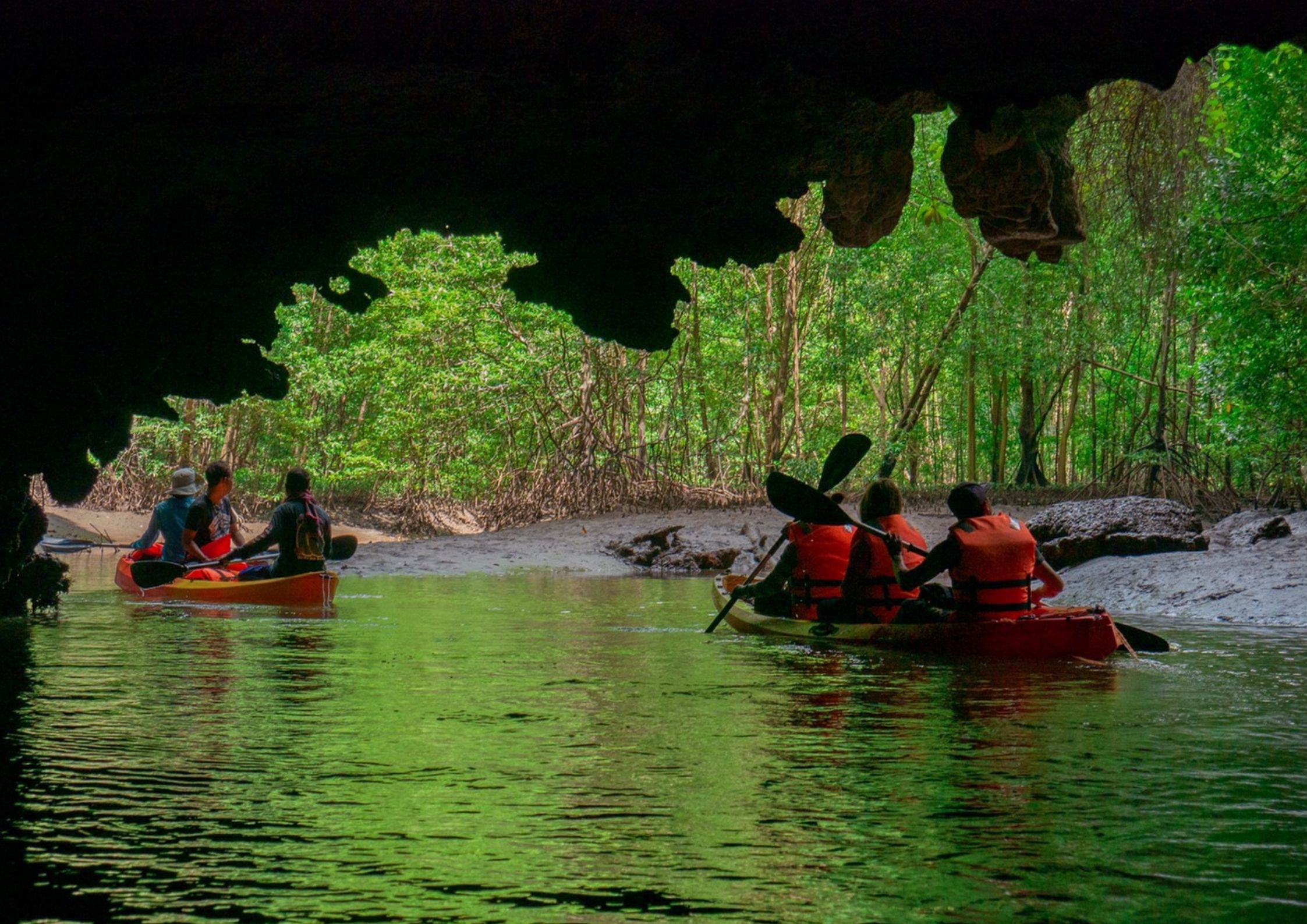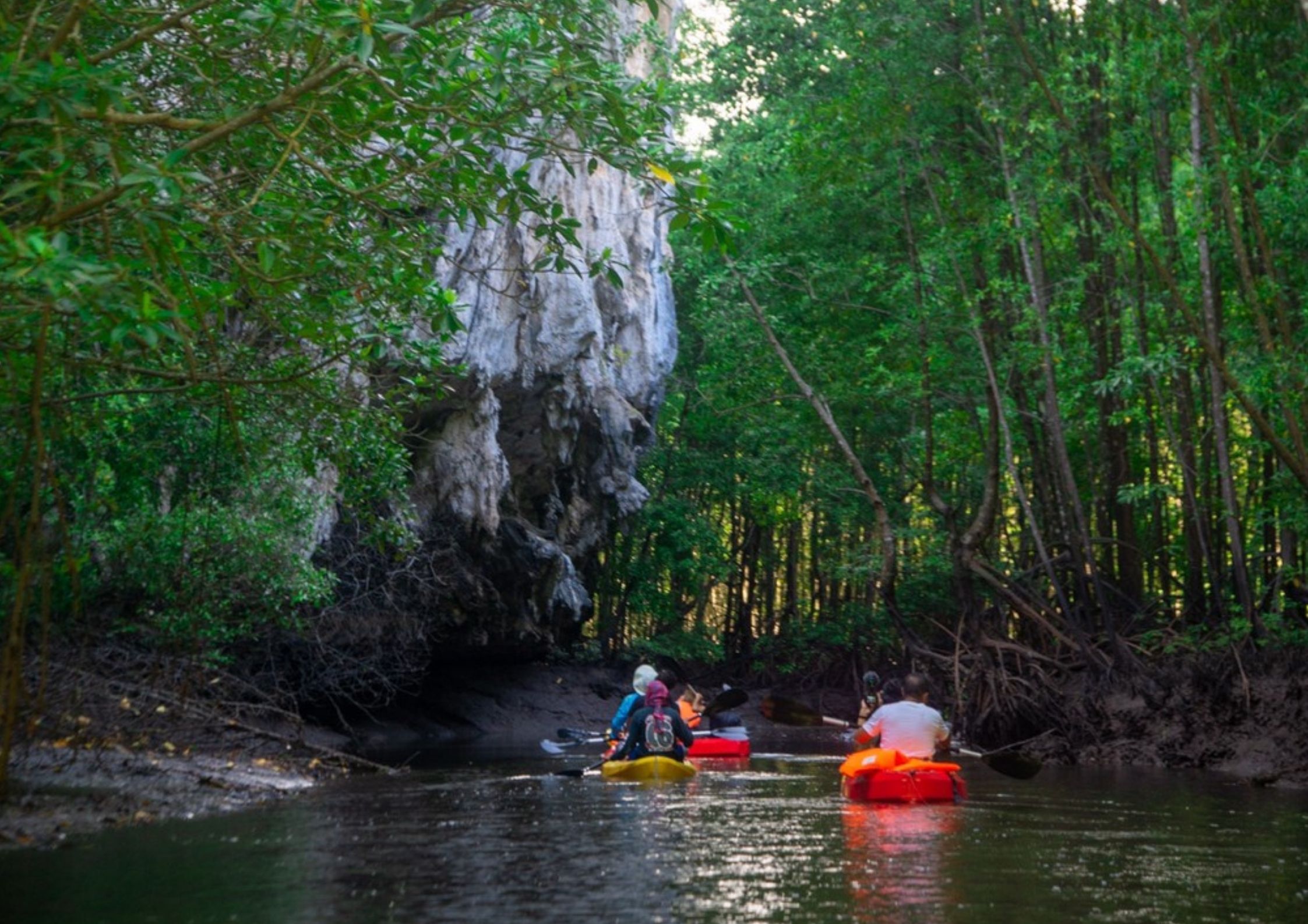เดินทางถึงจุดที่พายเรือคายัค ไปทางเข้าทางคลองจระเข้ขาว จากนั้นก็พายเรือคายัค เข้าไปชมนกชมไม้รอบๆด้วย ป่าโกงกางแสงสว่างเดียวในถ้ำคลอง จระเข้ขาวนี้คือแสงสาดส่องภายในถ้ำ สนุกสนาน ตื่นเต้นดี ระยะทางสั้นๆไม่ถึงห้านาที ก็เจอแสงสว่างปลายอุโมงค์ ปลายอุโมงค์จะเป็นพื้นที่ป่าชายเลน ที่รายล้อมด้วยหุบเขา ราวกับหลุดมาในอีกโลกนึ่ง คล้ายๆกับถ้ำมรกต แต่กว้างกว่ามาก ด้านในเป็นป่าชายเลน เจอปลาตื่น ปูและสัตว์อื่นๆมากมาย สภาพที่นี่ยังดิบอยู่มาก